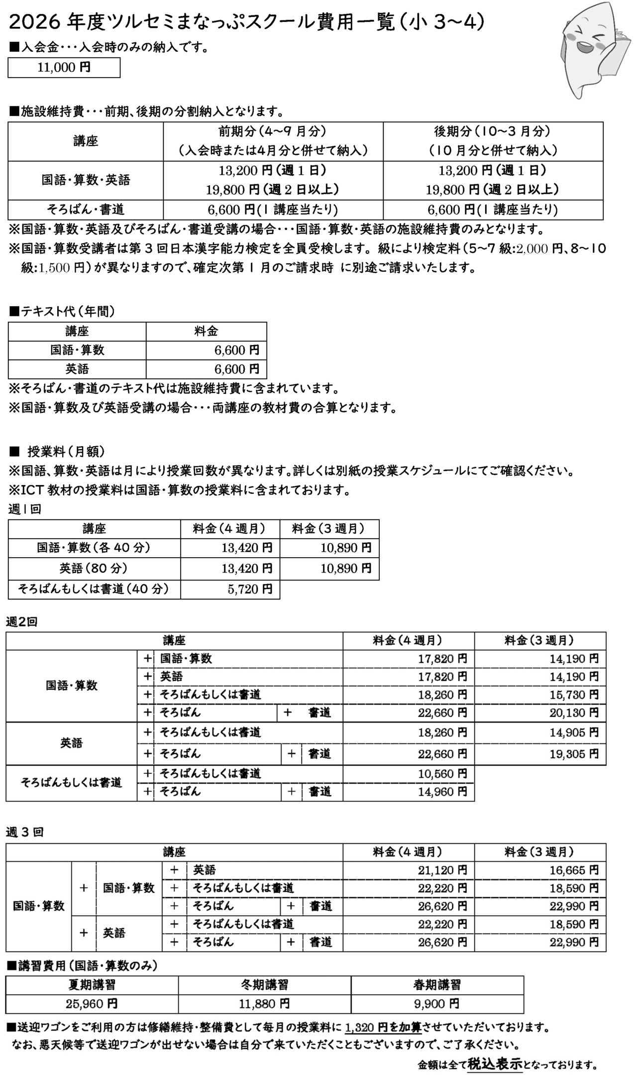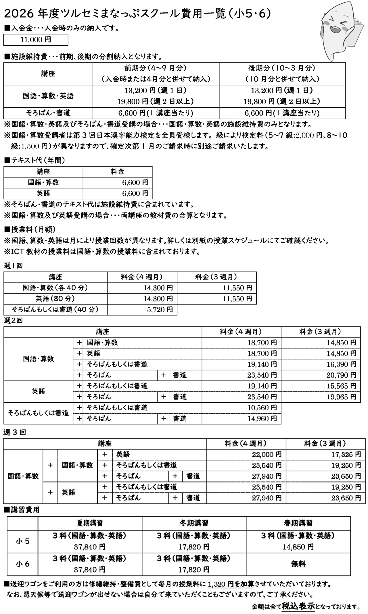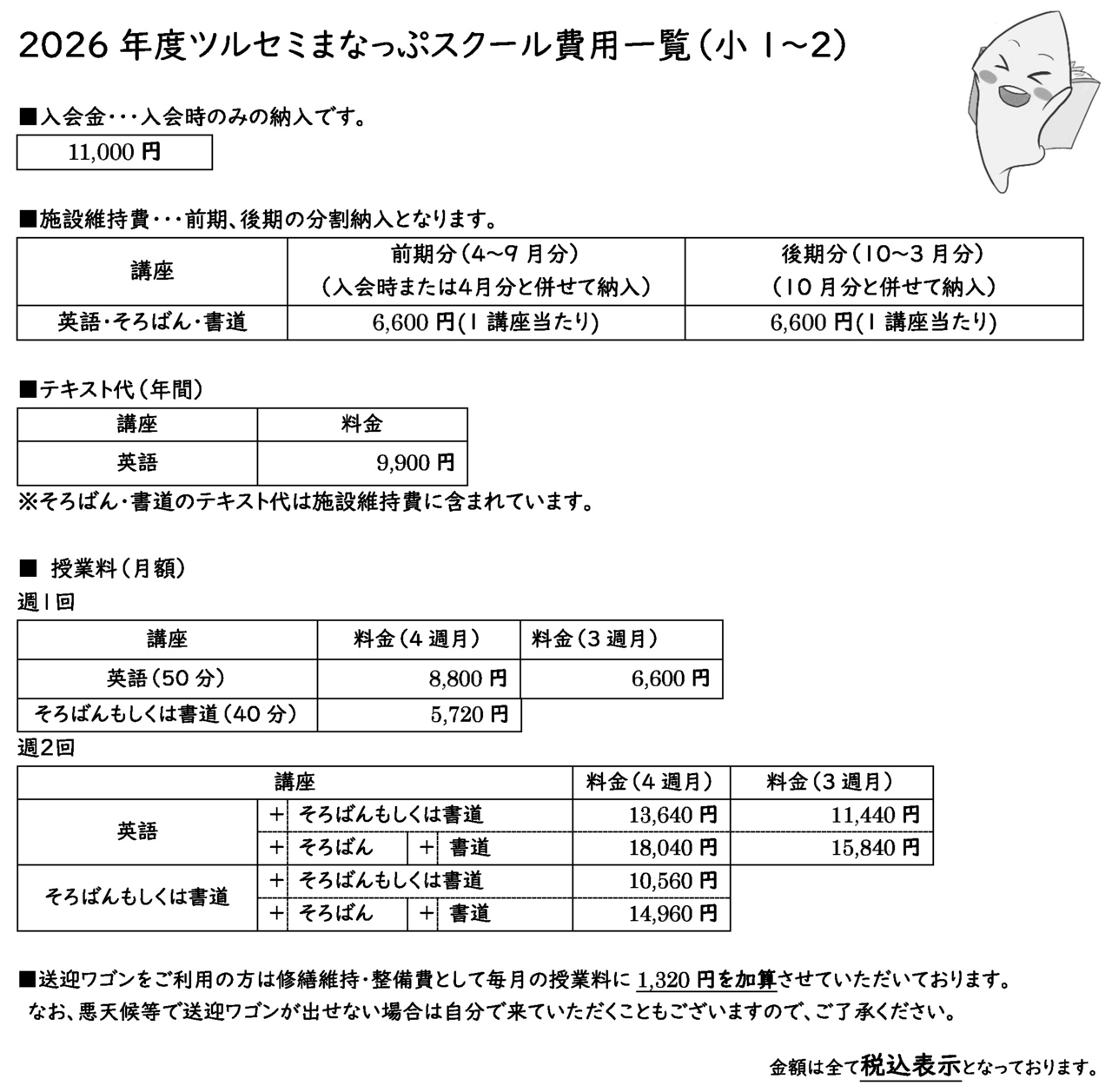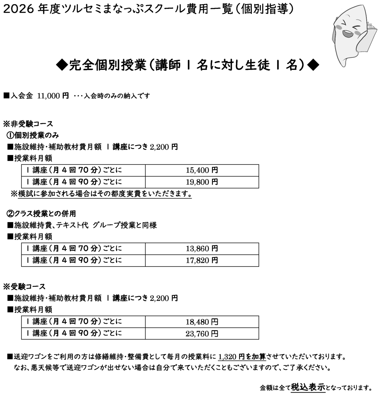 ■入会金・・・11,000円(入会時のみ) ■送迎ワゴンご利用の方・・・利用:1,320円(月額)